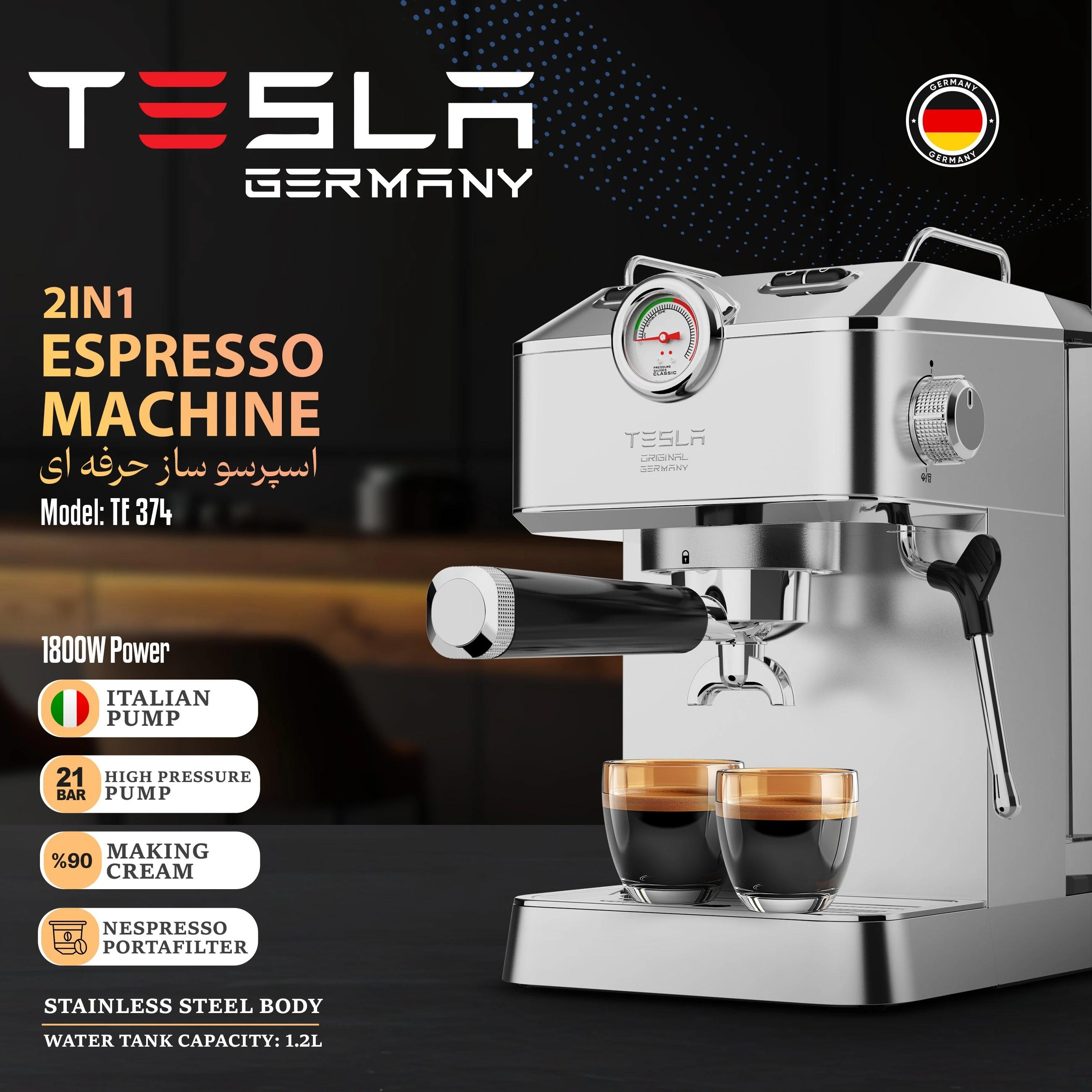 ☕ اسپرسوساز تسلا TE 374 با ترکیب آسیاب داخلی و دو بویلر مجزا، طعم غنی و کنترل حرفهای اسپرسو را در خانه شما فراهم میآورد.