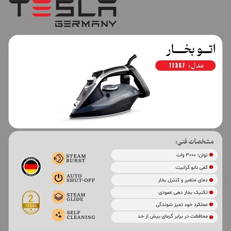 اتو بخار تسلا TE 367 با توان بالا (۳۰۰۰ وات) و خروجی بخار تا ۳۸۰ گرم در دقیقه، از عهدهی انواع پارچهها از جمله جین و کتوشلوار بهراحتی برمیآید.